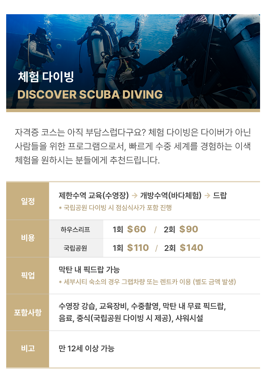 아름다운 수중세계를 경험해보세요. 더마크 체험다이빙